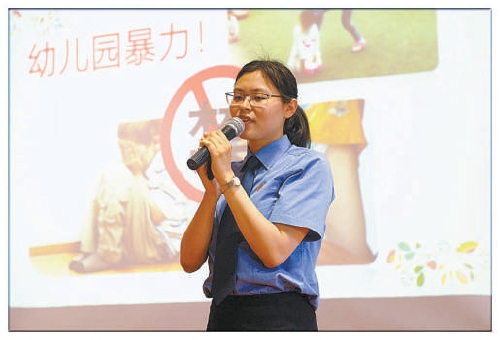 未检工作,为爱发声。她去过1000余人的军训大操场,也参加过10余人的座谈会;既到过带专业收音设备的大礼堂,也去过连投影仪都没有的中学操场。她的听众,有小学生、中学生,也有幼儿园老师,只要是关系孩子权益的地方,她都要为爱发声。